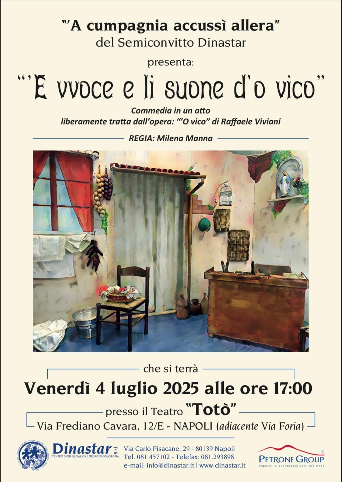 Da questo percorso nasce “‘E vvoce e li suone d’o vico”, commedia in un atto liberamente tratta dall’opera” ‘O vico” di Raffaele Viviani, un figlio di Napoli che andrà in scena venerdì 4 luglio alle ore 17 al teatro Totò, nel cuore antico di Napoli.
