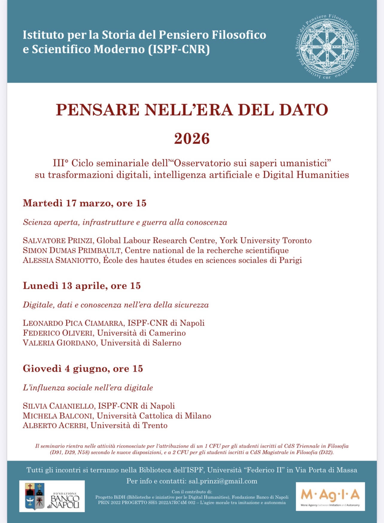 Torna a Napoli “Pensare nell’era del dato”, terzo ciclo di seminari dedicato alle trasformazioni generate da intelligenza artificiale, infrastrutture digitali e nuovi ecosistemi informativi. Si parte martedì 17 marzo alle 15 nella Biblioteca dell’Istituto per la Storia del Pensiero Filosofico e Scientifico Moderno, Università Federico II in Via Porta di Massa.