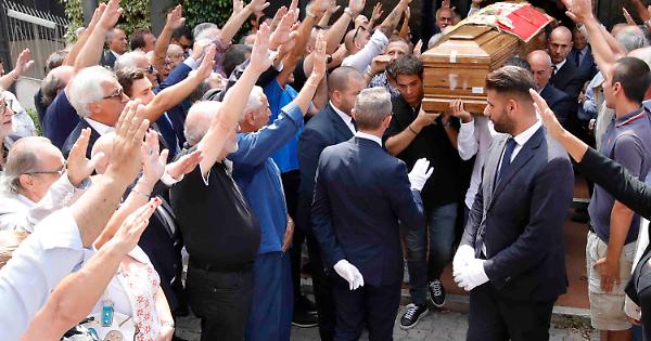 NAPOLI. Saluto fascista e l'urlo, ripetuto tre volte: "Attenti, camerata Antonio Rastrelli presente". È terminato così, all'esterno della chiesa del Sacro Cuore, in corso Vittorio Emanuele a Napoli, il funerale di Antonio Rastrelli, ex presidente della Regione Campania, senatore e sottosegretario al Tesoro nel primo Governo Berlusconi, morto giovedì 15 aprile all'età di 91 anni. Presenti molti amici e compagni di partito che sono stati vicini all'ex governatore campano nel corso della sua esperienza nel Movimento sociale italiano e poi in An. Al termine della funzione, l'uscita del feretro dalla chiesa è stata accolta dal saluto, ripetuto tre volte e dal saluto romano.