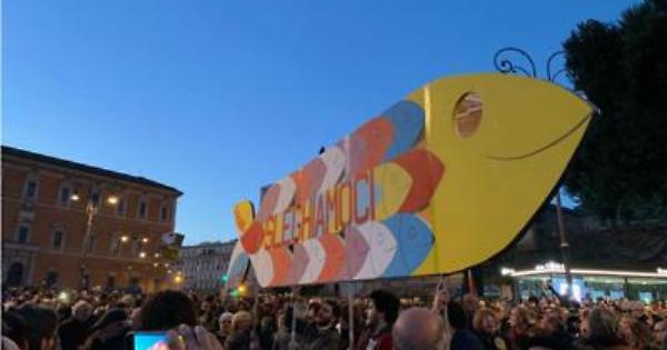 ROMA. Le sardine riempiono piazza San Giovanni,decine di migliaia a cantare “Bella Ciao”, ma anche l’Inno di Mameli. Gli slogan sono tanti, ma il più ricorrente è “Roma non si Lega”, per ribadire lo spirito antisovranista con cui un mese fa, da piazza Maggiore a Bologna, nasceva il movimento. Perché «quando la bestia del populismo fa campagna sul tuo territorio hai due scelte: stringerti o perderti. La piazza di Bologna ha scelto di stringersi e dire “qui non si passa”», tuona il fondatore, Mattia Santori, senza mai nominare Salvini. In un mese le sardine hanno riempito 113 piazze in Italia e all’estero. Il segnale si è amplificato e ha assunto forme diverse, ma gli attivisti continuano a negare l’intenzione di trasformarsi in un partito o in un movimento: «Non c’è peggior sordo di chi non vuol sentire», scherza Santori, ma mica tanto. Non è chiarissimo in cosa si declinerà questa moltitudine. Il fondatore parla di persone scomode, che «non abboccano», raccolte in un «aggregatore di idee». Però hanno una sorta di manifesto, sei richieste alla politica, sei “pretese” per la precisione: «Pretendiamo che chi è stato eletto vada a fare politica in sede istituzionale e non campagna elettorale permanente. Pretendiamo che chiunque ricopre la carica di ministro comunichi solo sui canali istituzionali. Pretendiamo trasparenza nell’uso che la politica fa dei social, sia economica sia comunicativa. Pretendiamo che il mondo dell’informazione protegga, difenda e traduca questo sforzo in messaggi fedeli ai fatti. Pretendiamo che la violenza venga esclusa dai toni e dai contenuti della politica in ogni sua forma. È il momento che la violenza verbale venga equiparata alla violenza fisica. Chiediamo di ripensare al decreto sicurezza».