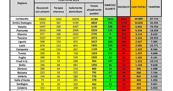 I dati sono stati diffusi dalla Protezione Civile. I guariti in totale sono 10.361, 999 in più rispetto a ieri. I casi attualmente positivi nel complesso sono 62.013. In isolamento domiciliare 33.648, mentre 24.753 sono ricoverati con sintomi. I pazienti in terapia intensiva sono 3.612.