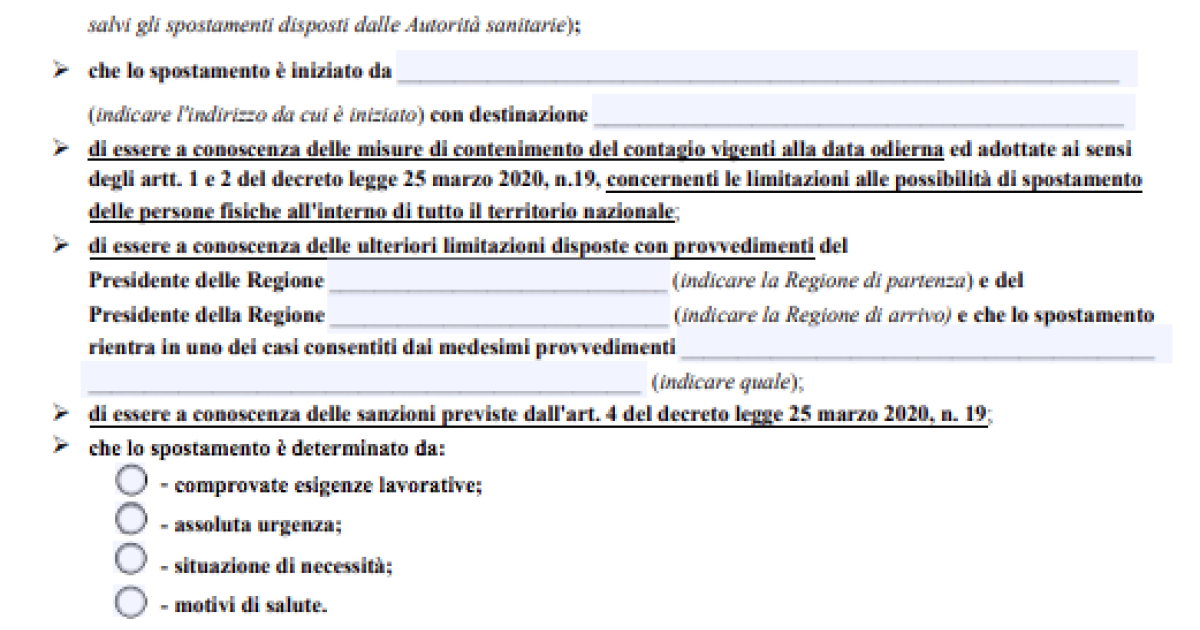 È disponibile sul sito del ministero dell'Interno il modello di autodichiarazione per gli spostamenti da domani. Può essere ancora utilizzato il precedente modello barrando le voci non più attuali. L'autodichiarazione è in possesso degli operatori di polizia e può essere compilata al momento del controllo.