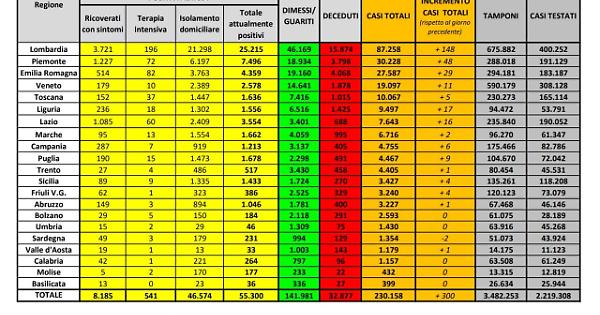 Gli attualmente positivi sono diminuiti di 1.294 unità nelle ultime 24 ore, per un totale di 55.300. I guariti sono invece aumentati di 1.502 da ieri e in tutto sono 141.981. I casi totali dall'inizio dell'emergenza sono 230.158 (+300). In tutto sono stati eseguiti 3.482.253 tamponi, i casi testati sono 2.219.308.