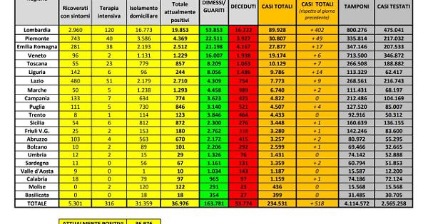 Sono 85 i morti per Coronavirus in Italia nelle ultime 24 ore, per un totale di 33.774 decessi dall'inizio dell'emergenza. Secondo i dati forniti dalla Protezione Civile rispetto a ieri si registra una nuova impennata dei casi totali, aumentati di 518 unità: un incremento dovuto in buona parte ai numeri della Lombardia, dove con l'aumento significativo dei tamponi effettuati (19389 contro i 3410 di ieri) sono segnalati anche 402 nuovi casi. I casi totali nel Paese dall'inizio dell'emergenza salgono così a 234.531.