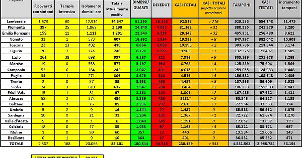 Altri 66 morti in Italia per coronavirus. Le vittime salgono a 34.514 dall'inizio dell'emergenza, secondo i dati diffusi dalla Protezione Civile. Il totale delle persone che hanno contratto il virus è di 238.159 con un incremento rispetto a ieri di 333 nuovi casi. Il 64% dei nuovi contagi è in Lombardia, 4 le regioni a zero contagi. Si tratta di Basilicata, Molise, Valle d'Aosta e Umbria. Il numero complessivo dei dimessi e guariti sale invece a 180.544, con un incremento di 1.089 persone rispetto a ieri. Nelle ultime 24 ore sono stati eseguiti 58.154 tamponi.