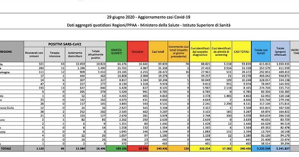Sono 16.496 gli attualmente positivi in Italia con una diminuzione di 185 persone rispetto a ieri affette dal virus. Sono i dati forniti dal ministero della Salute sulla situazione del contagio in Italia. 126 i nuovi casi, con il totale dei contagiati da inizio emergenza che sale a 240.436. 6 in tutto i morti nelle ultime 24 ore, il numero più basso dal 28 febbraio e lo stesso che si registrò il 24 febbraio scorso. Il totale delle vittime sale così a 34.744.