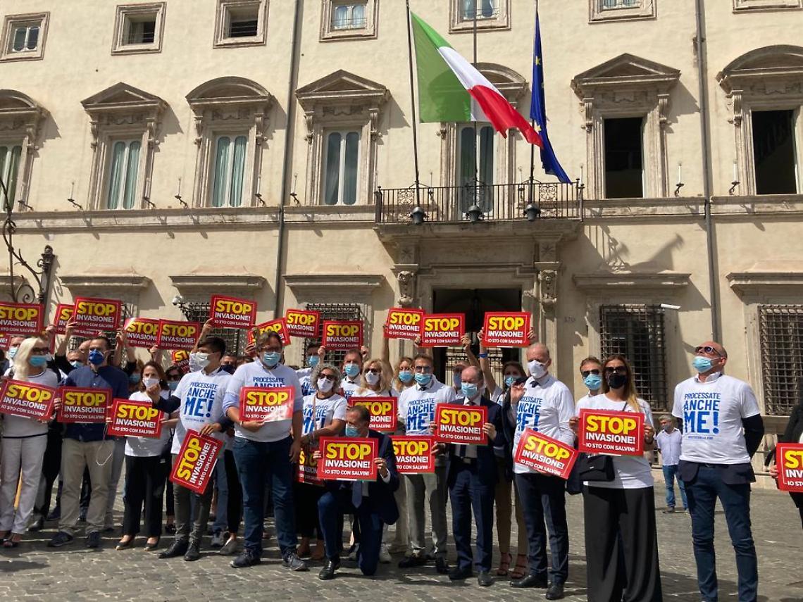 Muovono da piazza Montecitorio fino alla vicinissima piazza colonna, dove ha sede il governo, indossano t-shirt bianche con la scritta 'processate anche me - io sto con Salvini', cartelli Rossi tra le mani con su scritto 'stop invasione'.