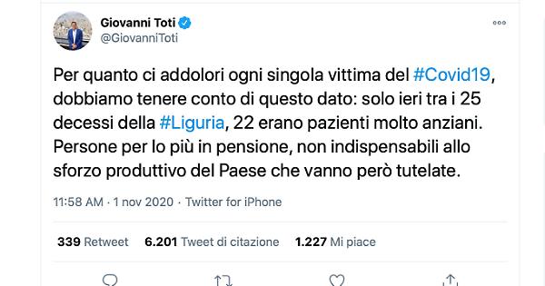 Bufera su un tweet del governatore della Liguria, Giovanni Toti, nel giorno dell'incontro delle Regioni con il Governo. A scatenare migliaia di reazioni su Twitter, queste frasi sul coronavirus e le sue vittime: «Per quanto ci addolori ogni singola vittima del Covid19, dobbiamo tenere conto di questo dato: solo ieri tra i 25 decessi della Liguria, 22 erano pazienti molto anziani. Persone per lo più in pensione, non indispensabili allo sforzo produttivo del Paese che vanno però tutelate», scrive il governatore. Poi una rettifica dello staff: «Il senso di questo tweet, che appartiene a un ragionamento più ampio, è stato frainteso. I nostri anziani sono i più colpiti dal virus, sono persone spesso in pensione che possono restare di più a casa e essere tutelate di più».