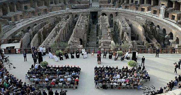 "Un anno fa - ricorda ancora il Papa - incontrandoci proprio qui, davanti al Colosseo, lanciammo un appello, oggi ancora più attuale: ’Le Religioni non possono essere utilizzate per la guerra. Solo la pace è santa e nessuno usi il nome di Dio per benedire il terrore e la violenza. Se vedete intorno a voi le guerre, non rassegnatevi! I popoli desiderano la pace’. E quanto cercheremo di continuare a fare, sempre meglio, giorno per giorno. Quindi il monito: "Non rassegniamoci alla guerra, coltiviamo semi di riconciliazione; e oggi eleviamo al Cielo il grido della pace, ancora con le parole di San Giovanni XXIII: ‘Si affratellino tutti i popoli della terra e fiorisca in essi e sempre regni la desideratissima pace’".