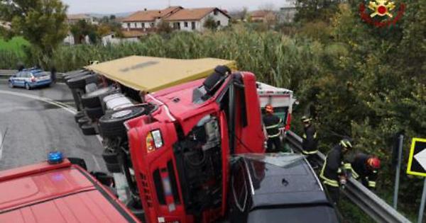 Un autoarticolato si è ribaltato schiacciando un'ambulanza a Chiaravalle, in provincia di Ancona. L'autista del mezzo di soccorso e il paziente trasportato sono morti mentre è rimasto gravemente ferito l'altro soccorritore.