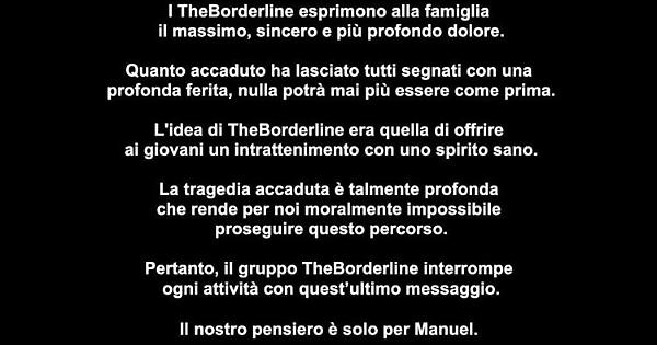 "I TheBorderline esprimono alla famiglia il massimo, sincero e più profondo dolore - scrivono - Quanto accaduto ha lasciato tutti segnati con una profonda ferita, nulla potrà mai più essere come prima. L'idea di TheBorderline era quella di offrire ai giovani un intrattenimento con uno spirito sano. La tragedia accaduta è talmente profonda che rende per noi moralmente impossibile proseguire questo percorso. Pertanto, il gruppo TheBorderline interrompe ogni attività con quest'ultimo messaggio. Il nostro pensiero è solo per Manuel".