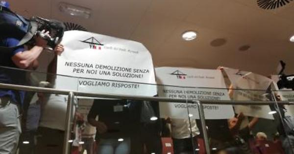 I residenti chiedono di poter rientrare nelle proprie abitazioni nella zona rossa per recuperare gli effetti personali lasciati durante l'emergenza. Le proteste sono scattate quando i residenti non sono stati fatti entrare in aula per assistere al consiglio. La situazione è poi rientrata con i cittadini ammessi a seguire l'assemblea in parte dagli spalti della sala consiliare e in parte in due sale attiguo attrezzate con monitor. Al momento in aula si trovano circa un'ottantina di persone, con cartelli che recitano "Nessuna demolizione senza per noi una soluzione". "Prima noi delle imprese, ridateci le nostre case. Rispetto", hanno scandito più volte i residenti presenti.