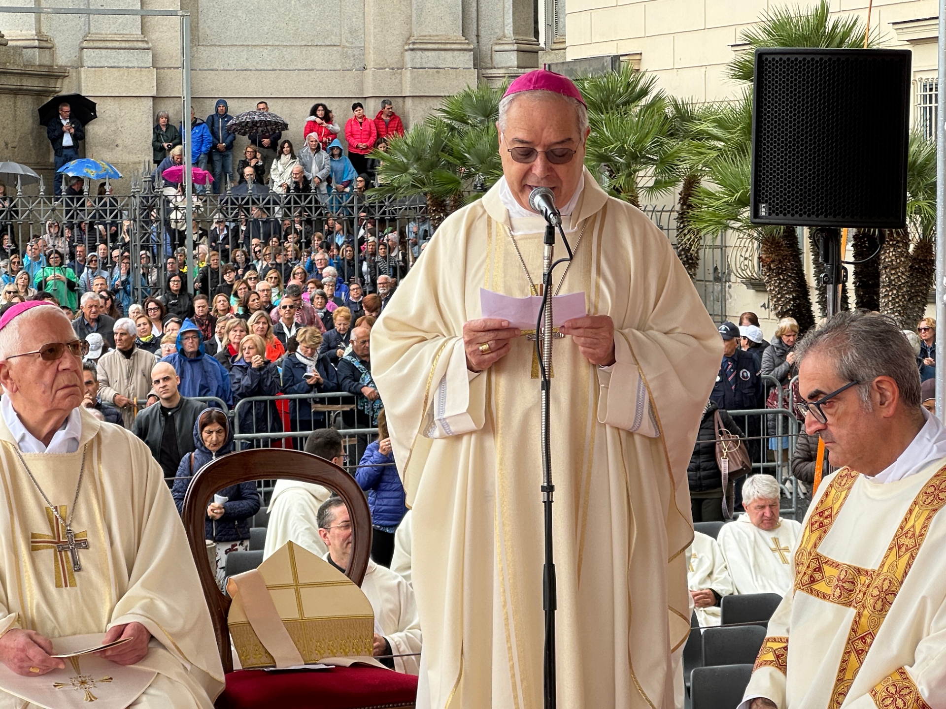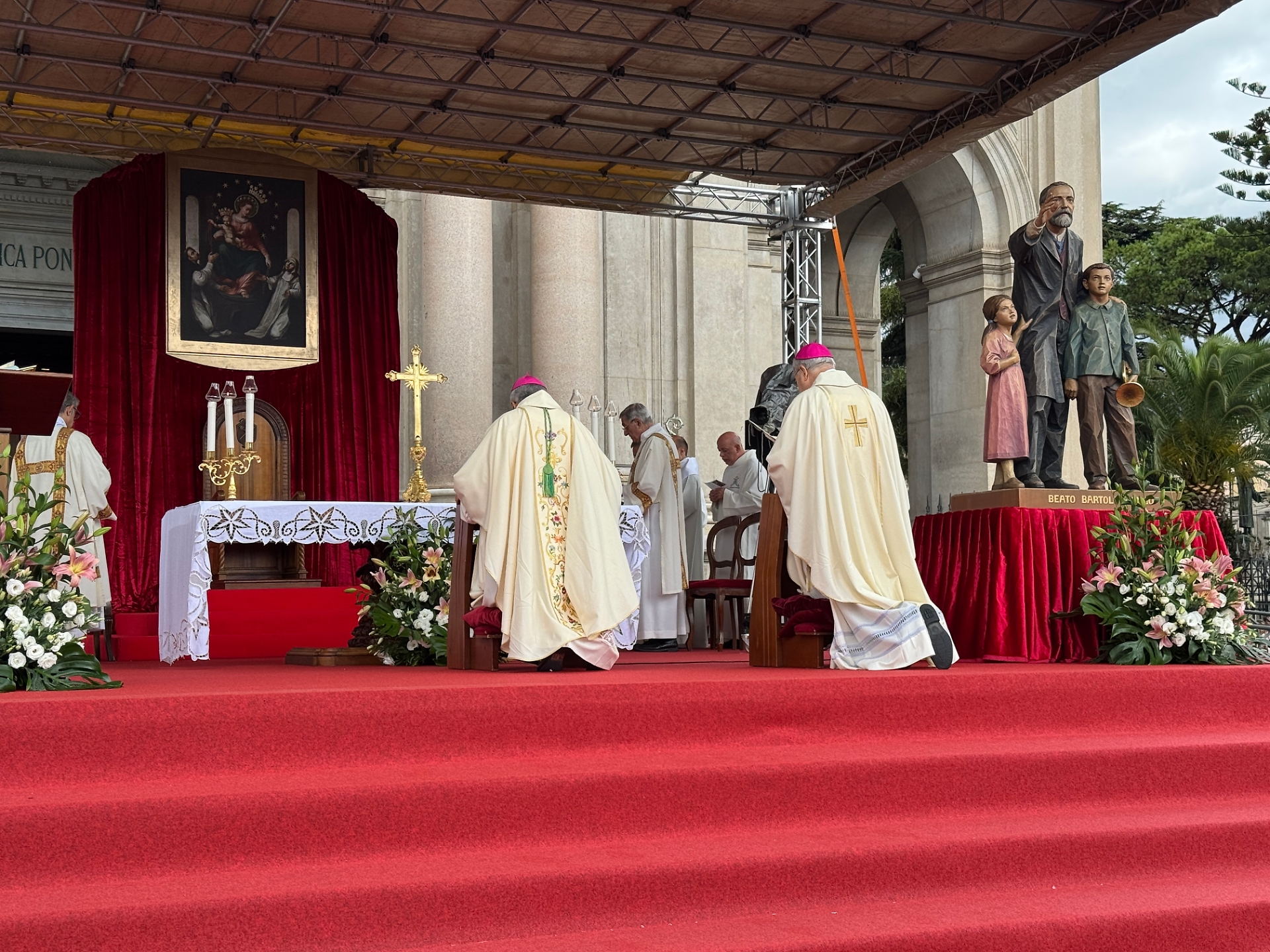 L'urgenza di ottenere questa grazia per l'umanità è stata richiamata dalle parole di monsignor Vincenzo Pisanello, vescovo di Oria, la diocesi di cui era originario il Fondatore del Santuario di Pompei ricordando come viviamo una “Terza guerra mondiale a pezzi”, come descritta da Papa Francesco. Tutti hanno quindi pregato per la pace durante la solenne celebrazione eucaristica in occasione della Supplica alla Vergine del Santo Rosario di Pompei. La messa è stata celebrata insieme con l’Arcivescovo Tommaso Caputo e decine di sacerdoti, mentre centinaia di fedeli sfidavano il meteo avverso, affollando il sagrato Bartolo Longo per pregare sotto la pioggia battente.