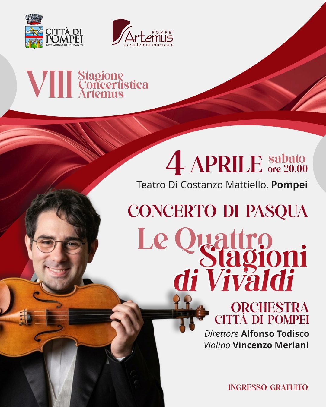 POMPEI. Con il concerto “Le quattro stagioni” di Vivaldi, in programma sabato 4 aprile 2026 alle ore 20 al teatro “Di Costanzo Mattiello” di Pompei (ingresso gratuito), entra nel vivo l’ottava Stagione Concertistica Artemus, giunta al suo terzo appuntamento.