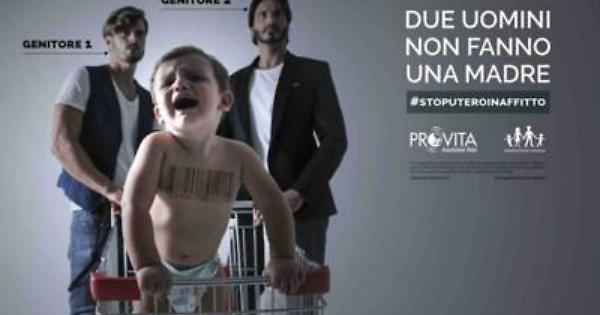 Inizia oggi con un'immagine choc la campagna nazionale di Pro Vita e Generazione Famiglia, associazioni promotrici del Family Day, "per il diritto dei bambini a una mamma e un papà". Nei manifesti, affissi a Roma, Milano e Torino e accompagnati da camion vela, appaiono due giovani che spingono un carrello con dentro un bambino disperato, comprato dalla coppia, individuati come 'genitore 1' e 'genitore 2', e a fianco la scritta: "Due uomini non fanno una madre. #StopUteroinAffitto”.
