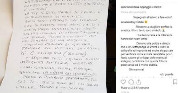 Una lettera scritta a mano con minacce, pesantissime, nei confronti di Enrico Mentana e di alcuni giornalisti di La7. Questo quanto mostrato oggi dal direttore del tg della rete, che ha pubblicato su Instagram uno scatto della missiva. Nessuna firma sul foglio, ma una svastica e un "boia chi molla" in calce.