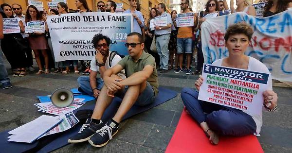 NAPOLI. Prosegue la protesta dei navigator campani contro la decisione della Regione Campania di non sottoscrivere la convenzione con Anpal. Dalle 10.30 di domani, martedì 3 settembre, riparte il presidio sotto Palazzo Santa Lucia, sede della Regione Campania, «in attesa - si legge in una nota - di un intervento risolutivo da parte delle istituzioni. Dopo l' incontro di stamane con la Prefettura di Napoli e con le rappresentanze sindacali, la lotta per far valere i nostri diritti non si ferma». Cinque navigator avevano già indetto nei giorni scorsi uno sciopero della fame, sospeso dopo 5 giorni dopo che due manifestanti sono stati colti da malore.