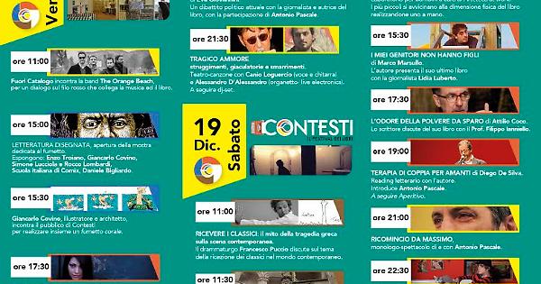15:00 Letteratura disegnata, apertura della mostra dedicata al fumetto. Espongono: Enzo Troiano, Giancarlo Covino, Simone Lucciola e Rocco Lombardi, Scuola italiana di Comix, Daniele Bigliardo.