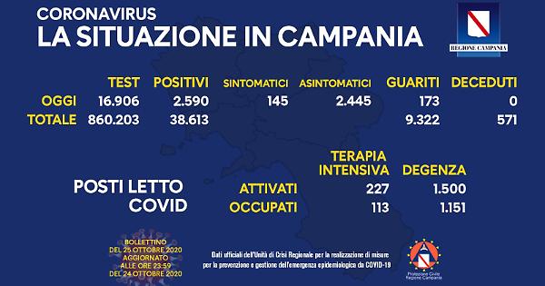 NAPOLI. Nuova impennata di contagi in Campania. Il bollettino di oggi dell'Unità di Crisi Regionale porta a 2.590 i positivi di oggi, di cui: asintomatici 2.445; sintomatici. 145 su un totale di tamponi effettuati pari a 16.906. Nel dettaglio, dei nuovi contagiati ben 2.221 sono tra Napoli e provincia (solo Napoli 488), Caserta 190, Salerno 260, Avellino 72 e Benevento 63.