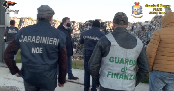 Due arresti in carcere, uno ai domiciliari e tre divieti di dimora sono stati eseguiti stamane dai carabinieri del Comando Provinciale di Bari e dai finanzieri del Comando Provinciale di Foggia, unitamente al Servizio Centrale Investigativo Criminalità Organizzata (Scico) della Guardia di Finanza e ai Nuclei Operativi Ecologici dei carabinieri di Bari e Pescara e con l'ausilio di un elicottero della Sezione Area della Guardia di Finanza di Bari, per lo stoccaggio illecito di una ingente quantità di rifiuti solidi prevalentemente provenienti da comuni della provincia di Caserta, in siti all'aperto o all'interno di capannoni industriali reperiti nelle province di Foggia e Chieti.