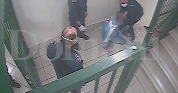 Lo striscione, che fa riferimento ai 52 poliziotti penitenziari destinatari di misure cautelari emesse per i pestaggi dei detenuti avvenuti il 6 aprile 2020 nel carcere di Santa Maria Capua Vetere, è stato poi rimosso.