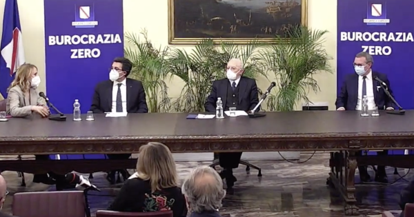 «Spesso l'Italia è bloccata non tanto dalla mancanza di risorse ma dalla palude burocratica, amministrativa e giudiziaria. Abbiamo deciso che per quello che riguarda le nostre competenze dobbiamo arrivare al traguardo burocrazia zero» spiega il governatore De Luca che parla di «obiettivo importante già previsto nella precedente legislatura» e poi ostacolato dal sopraggiungere di problemi «come il Covid, la mancanza di personale e il commissariamento della Sanità».