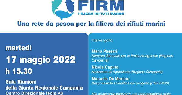 Martedì 17 maggio alle ore 15:30 si terrà la conferenza stampa per il lancio del progetto “FIRM - Una rete da pesca per la filiera dei rifiuti marini”, presso la Sala Riunioni della Giunta Regionale Campania, piano terra della sede del CDN Isola A6. Il progetto FIRM sarà presentato dalla responsabile scientifica, dott.ssa Marcella De Martino insieme ad una rappresentanza delle organizzazioni dei pescatori partner del progetto. All’evento, interverranno l’assessore all’Agricoltura della Regione Campania, Nicola Caputo ed il direttore generale per le Politiche Agricole, Maria Passari.