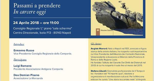 Domani, 24 aprile, alle ore 11 presso la sala del Consiglio Regionale, 1° piano “sala schermo” Centro Direzionale, ci sarà la presentazione del libro “Passami a prendere In carcere oggi ” di Angiolo Marroni e Stefano Liburdi, a questa giornata di riflessione, oltre agli autori, parteciperanno il Garante dei detenuti Campano Samuele Ciambriello, il Vice Presidente del consiglio della Regione Campania Ermanno Russo, il Presidente dell’Associazione Antigone Luigi Romano, Presidente dell’Associazione Virtus Italia Enrico Sanchi, rappresentante Associazione La Mansarda Dea Demian Pisano e il detenuto ergastolano Cosimo Rega.