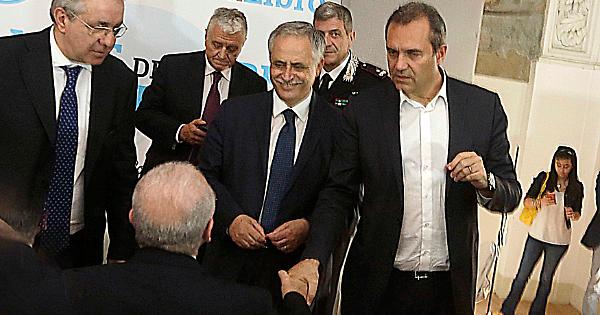 NAPOLI. Stretta di mano tra il sindaco di Napoli, Luigi de Magistris, e il presidente della Regione Campania, Vincenzo De Luca, all'apertura di NapoliCittaLibro a Castel Sant'Elmo. Il primo ad arrivare è stato il presidente De Luca che, dopo una visita agli stand, ha preso posto in auditorium dove più tardi è giunto il sindaco de Magistris che, salito sul palco, ha stretto la mano al governatore e agli presenti.