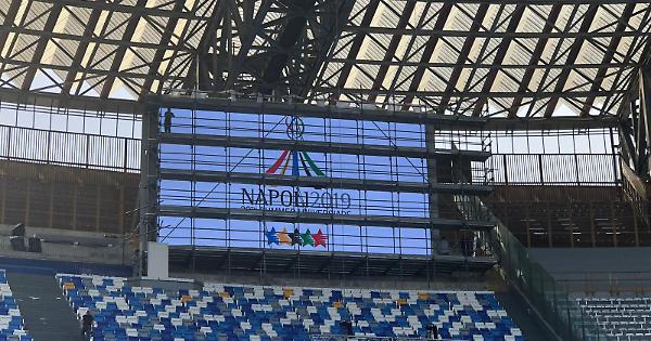 Nel pomeriggio di venerdì sul video wall posizionato sulla Tribuna Nisida i tecnici della società Deltronics hanno effettuato i test di accensione, configurazione e calibratura. Nei prossimi giorni verrà acceso anche il secondo maxi schermo istallato nella zona Distinti. Su entrambi i monitor il prossimo 3 luglio verrà proiettata la cerimonia d'apertura dell’Universiade e poi dall’8 al 13 luglio le gare di Atletica. I maxi schermi rimarranno nella disponibilità dello stadio anche per le partite del Calcio Napoli a partire dal prossimo Campionato. Soddisfatto il Commissario Straordinario di Napoli 2019, Gianluca Basile, che ha voluto ringraziare i tecnici dell’ARU Salvatore Ferrandino, che ha curato la parte tecnologica dell’istallazione, e Filomena Smiraglia, l’architetto responsabile dei lavori al San Paolo.
