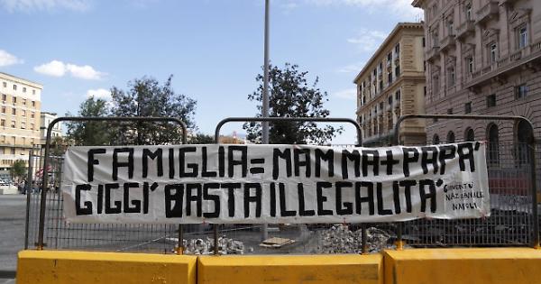 NAPOLI Stamattina a piazza Municipio è stato esposto uno striscione in polemica con la vicenda delle due mamme sposate a Barcellona che hanno trascritto a Napoli l'atto di nascita del figlio Ruben. "Famiglia=mamma e papà. Giggì basta illegalità" lo slogan diretto da Gioventù nazionale al sindaco. L'iscrizione voluta dal sindaco De Magistris ha provocato già da giorni un acceso dibattito e la Prefettura di Napoli ha richiesto la documentazione dell'atto amministrativo per valutarne, insieme al Ministero dell'Interno, la validità.