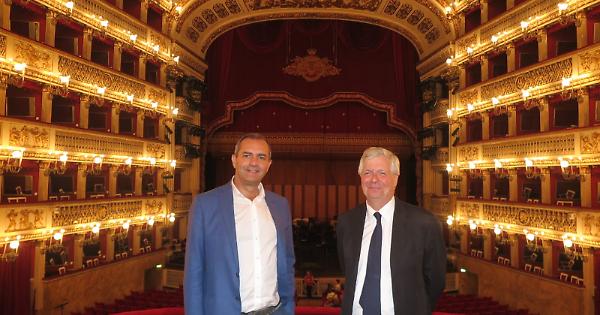 NAPOLI. Il sindaco di Napoli Luigi de Magistris ha ricevuto nel pomeriggio a Palazzo San Giacomo Stéphane Lissner, nuovo soprintendente del Teatro San Carlo. Il primo cittadino ha voluto così accogliere in città il nuovo vertice del Massimo partenopeo per augurargli buon lavoro ed anche per rinnovare gli attestati della grandissima stima ad un grande protagonista della cultura mondiale. Dopo il tradizionale caffè, de Magistris ha voluto donare a Lissner il gagliardetto della città e un libro di fotografie dei luoghi più belli di Napoli: entrambi hanno voluto sfogliarlo fino all'immagine proprio del San Carlo. Lissner ha molto gradito l’omaggio del sindaco ed insieme, a piedi per via Verdi, hanno raggiunto il Teatro per una prima veloce visita, concedendosi una foto dal palco reale e dal palcoscenico alla presenza del soprintendente uscente Rosanna Purchia. In serata, Lissner assisterà al concerto di inaugurazione della stagione, diretto da Juraj Val?uha, con musiche di Gyorgy Ligeti e Gustav Mahler.