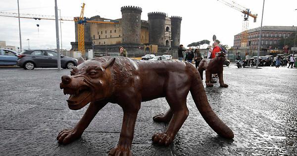 Eccoli qui. I lupi. Sono cento. Le fauci spalancate, i denti digrignati, il corpo pronto a scattare. Puntano verso un soldato gigante che, spalle a Palazzo San Giacomo, tenta di difendersi con uno spadone. “Wolves coming” è l’installazione di Liu Ruowang (nella foto/agn a destra con il sindaco) che ha invaso piazza Municipio dove resterà fino al 31 marzo. Si tratta di un’opera che l’artista cinese ha presentato quattro anni fa prima alla Biennale di Venezia e poi, in formato ridotto, all’università di Torino. Sono sculture iperrealiste (nella foto/agn a sinistra un particolare) in fusione di ferro che così, tutte insieme, hanno un aspetto piuttosto inquietante. Ieri la presentazione ufficiale: «Il lupo - spiega Nino Daniele che, da assessore alla Cultura (incarico che gli è stato revocato tre giorni fa, ndr) ha seguito tutta la costruzione dell’evento - non è sempre un simbolo del male. Pensate al famoso racconto del lupo di Gubbio, nei Fioretti di San Francesco. Dopo aver ammansito il lupo che li spaventava, il santo esortò gli abitanti dela città a impegnarsi a nutrirlo, perché così lui non avrebbe più avuto motivo di aggredirli. Ecco che il lupo viene a rappresentare le forze della natura che si ritorcono contro l’uomo se questi non le rispetta». Sulla stessa linea, la neo assessora alla Cultura, Eleonora de Majo: «Ringrazio per questa installazione che ha un potere spiazzante. È la fotografia della natura che si difende dalla complessiva visione del mondo espressa dal nostro secolo, definito “era del capitalocene”. Questi lupi sono l’invito alla riscossa e a riprendersi in mano i destino del mondo. Si inizia dalla paura per passare alla riscossa».