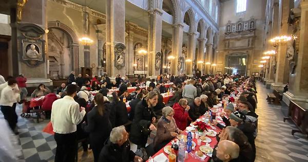 NAPOLI. Poveri, senza fissa dimora, immigrati, famiglie indigenti. Sono stati tutti invitati dall’arcivescovo di Napoli, il cardinale Crescenzio Sepe, per il pranzo di solidarietà che si è tenuto oggi in Duomo. Un modo per condividere un pasto, ma soprattutto un momento di festa e gioia, umanità e fraternità. All'incontro erano presenti anche i vescovi ausiliari.