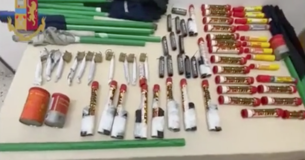 Nell'auto sono state rinvenute 24 aste rigide, 10 manufatti artigianali di illegale fabbricazione di tipo pirotecnico comunemente denominati "track", 12 "black thunder", 28 fumogeni, 2 barattoli di "smoke signals", 1 segnale fumogeno tipo "boetta", 10 fumogeni con "black thunder" uniti con nastro isolante bianco.