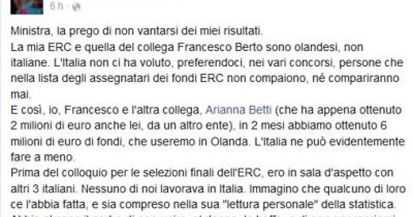 ROMA. "Ministra, la prego di non vantarsi dei miei risultati". Inizia così una durissima lettera di una ricercatrice delusa indirizzata al ministro Stefania Giannini, senatrice titolare del dicastero dell'Istruzione, dell'Università e della Ricerca. A scrivere su Facebook è Roberta D'Alessandro, fra i vincitori - con i colleghi Francesco Berto e Arianna Betti - del prestigioso bando europeo ERC Consolidator e in polemica con le dichiarazioni di Giannini proprio per un commento entusiasta del ministro ai risultati del bando che vede l'Italia terza per numero di assegnatari della borsa e prima per numero di ricercatrici vincitrici.