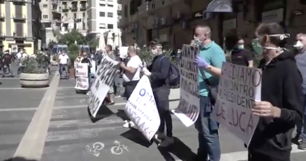 NAPOLI. «Ambulanti colpiti dal virus affondati dallo Stato». È lo striscione dei venditori ambulanti che protestano contro le restrizioni della Fase 2. I venditori dei mercati manifestano, mantenendo le distanze di sicurezza, davanti ad un ingresso laterale della Regione Campania. Chiedono la riapertura dei mercati o l'erogazione di sussidi o soluzioni occupazionali. Per simboleggiare la grave crisi in cui versano gli operatori del settore, gli ambulanti hanno portato una bara di cartone in piazza.