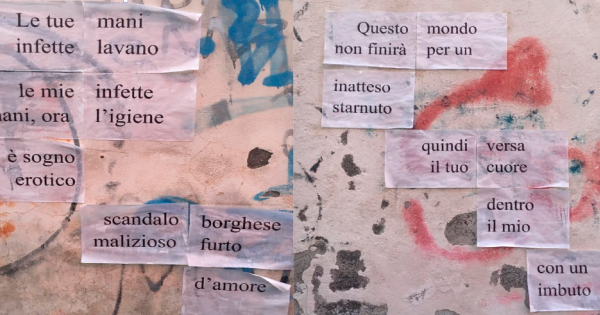 Il “poeta ignoto” ha disseminato le sue “perle d’amore” in giro per la città senza lasciare alcuna traccia dell’amata (o amato) a cui sono indirizzate. Ma quelle parole catturano e lasciano perplesso il passante, perché intrecciano due temi che colpiscono al cuore: il contagio da Coronavirus e l’amore. Che pur esso, forse, potrebbe diventare contagioso. Ma con ben altri risultati. E poi gli va dato anche il merito di volersi esprimere con il garbo di chi non intende imbrattare i muri con spray colorati e indelebili. Ma usa il fascino discreto di fogli bianchi incollati con un collante leggero che la prima pioggia e un po' di vento porterà via, come piume perse dalle ali di uccelli. È fortunato chi li vede sul proprio cammino.