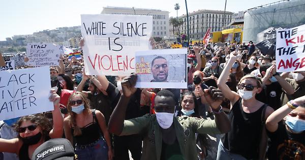 NAPOLI. Manfestazione a Napoli, davanti al consolato Usa, per chiedere giustizia per George Floyd. In centinaia tra studenti, migranti ed esponenti della rete antirazzista napoletana si sono ritrovati con cartelli, slogan, foto dell'afroamericano ucciso dalla polizia a Minneapolis. Molti dei manifestanti indossavano la mascherina, alcuni con la scritta “I can't breathe", non posso respirare, la frase pronunciata da Floyd prima di morire.