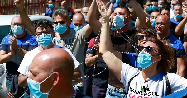 NAPOLI. Manifestazione dei lavoratori dello stabilimento Whirlpool di Napoli all'esterno della fabbrica in via Argine. Gli operai si sono incatenati tra loro, gesto simbolico per rappresentare «l'immobilismo del Governo che non permette di sbloccare questa situazione di prigionia dovuta alla scelta dell'azienda».
