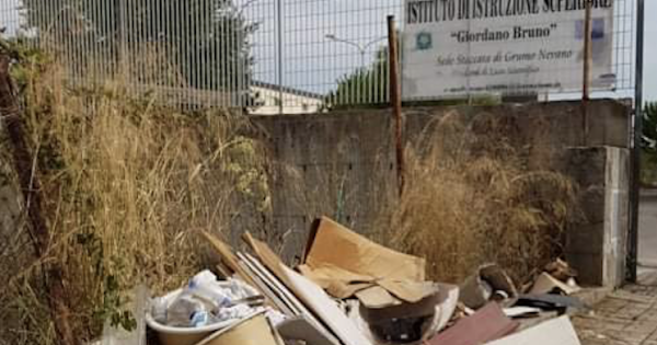 GRUMO NEVANO. Suona la campanella per l’inizio delle lezioni. E per docenti e genitori degli allievi del liceo scientifico “Giordano Bruno”, in via Capecelatro, sezione distaccata dell’istituto di Arzano, c’è l’amara sorpresa: cumuli di spazzatura indifferenziata, occludono quasi l’accesso al cancello dell’istituto. Accanto a sacchetti di spazzatura di origine domestica anche plastica, materassi, legno, mobili rottamati ed altri rifiuti. Per i genitori che hanno contattato il nostro giornale si tratta di «un pessimo biglietto da visita».