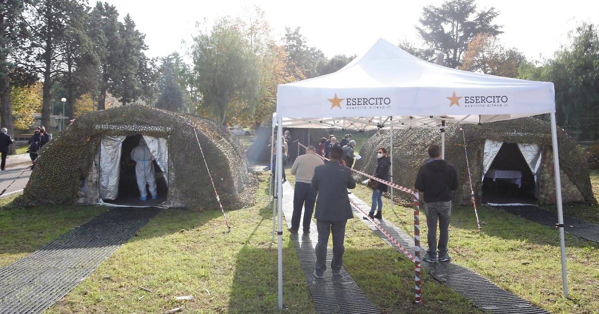 Due tende per i tamponi e altre due, più piccole, per i materiali. È il piccolo campo allestito dall'esercito italiano nell'area dell'Asl Napoli 1 al Frullone, in uno spazio ben distante dall'area dove i cittadini fanno il tampone dell'Asl, ormai in modo ordinato e senza troppa folla visto che lo si può fare solo con prenotazione. Le tende dell'esercito eseguono test solo per le forze dell'ordine (polizia, carabinieri, polizia municipale), vigili del fuoco e personale di strutture molto importanti della pubblica amministrazione, come il tribunale: stamattina gia' oltre cento persone hanno fatto il test.