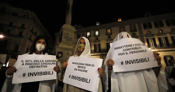 In abiti da fantasma. Così hanno protestato i commercianti nel corso di una manifestazione indetta da Confcommercio in diverse piazze della Campania. Questo pomeriggio, a Napoli, gli esercenti si sono dati appuntamenti in piazza dei Martiri, vestiti completamenti di bianco, e hanno esposto dei cartelli con la scritta "Invisibili", indicando problematiche e richieste che rivolgono al governo nazionale e regionale: credito d'imposta sugli affitti, cassa integrazione estesa per il prossimo anno e abolizione della tassazione locale da versare al 2021.