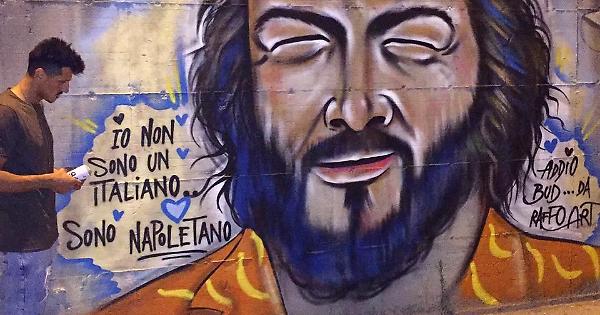“Cominciano i primi omaggi a Bud Spencer, un grande napoletano prima che un grande attore e uno sportivo di successo, e, già nel corso della notte, in via Ferrante Imparato, nella periferia orientale, è spuntato un murales di RaffoArt che ricorda la famosa frase in cui sottolineava di essere napoletano e non italiano”.