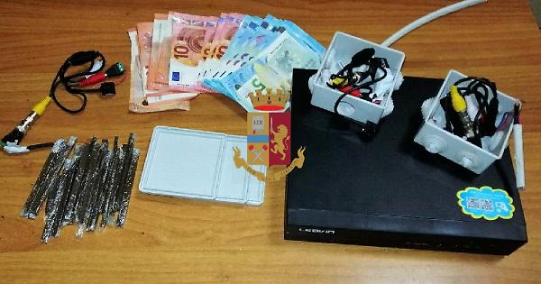 I poliziotti sono entrati nell’abitazione dove hanno rinvenuto, occultate in una busta di plastica, 19 stecche di hashish del peso di circa 60 grammi e 415 euro; inoltre, hanno accertato la presenza di un sistema di videosorveglianza a circuito chiuso che inquadrava il perimetro esterno dell’edificio e lo hanno sequestrato.