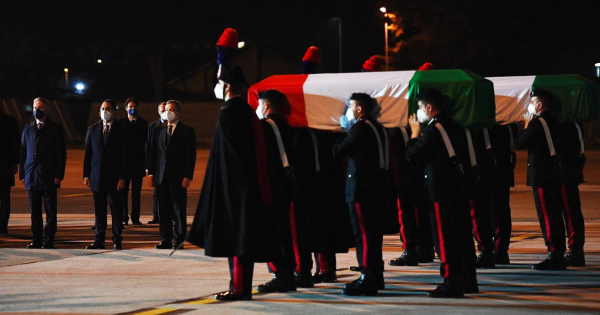 Sono arrivati alle 23.30 di ieri a Ciampino i feretri dell'ambasciatore Luca Attanasio e del carabiniere Vittorio Iacovacci, uccisi in Congo in un attacco al convoglio in cui viaggiavano. Ad attenderli, il presidente del Consiglio Mario Draghi, il ministro degli Esteri Luigi Di Maio e il ministro della Difesa Lorenzo Guerini.