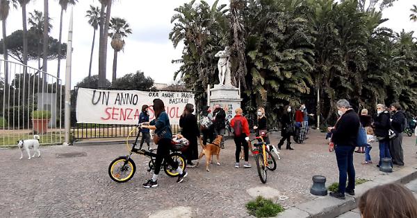 Adulti e bambini hanno attraversato la città da piazza Del Gesù, sono passati per via Toledo, per il Plebiscito dove hanno effettuato un giro largo della piazza a simboleggiare la riappropriazione dello spazio per poi arrivare in piazza Vittoria dove hanno dato vita a un presidio davanti ai cancelli chiusi della Villa comunale sui cui è stato affisso lo striscione “Un anno senza scuola".