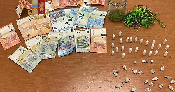 I poliziotti hanno raggiunto e bloccato lo spacciatore trovandolo in possesso di due involucri di eroina e di 325 euro; inoltre, hanno rinvenuto, occultato e mimetizzato nel manto erboso, un barattolo di vetro in cui era racchiuso un calzino con 17 involucri e 5 cilindretti della stessa sostanza per un peso complessivo di circa 12,2 grammi e 19 cilindretti e 3 involucri contenenti 17 grammi circa di cocaina.