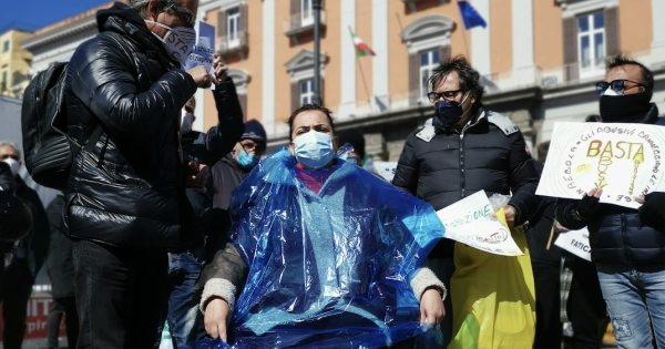 Protesta di parrucchieri ed estetisti questa mattina a Napoli in piazza del Plebiscito, davanti alla Prefettura. La manifestazione, organizzata da Confesercenti Campania, è stata convocata «per tutelare il settore benessere e parrucchieri, in gravissime difficoltà a causa dell'anno di pandemia». Circa mille i manifestanti della categoria "Immagine e benessere" di Confesercenti, con la partecipazione dell'associazione "Stamm Ca" e di altri rappresentanti delle partite Iva. Gli esercenti hanno simbolicamente sistemato una poltrona da coiffeur in piazza, calpestando a turno un registratore di cassa, segno della loro impossibilità a far fronte alle spese.