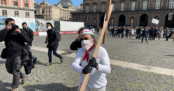 Lo chiamano “il pizzaiolo del Papa" perché in occasione del Giubileo straordinario della Misericordia fu scelto da Papa Francesco per preparare le pizze alla mensa del Vaticano. Oggi Vincenzo Staiano, titolare della pizzeria "O' Zi Aniello" di Lettere, nel Napoletano, si è recato in piazza del Plebiscito a Napoli per portare una delle 15 "croci" che affliggono gli esercenti in quest'anno di pandemia, unendosi alla manifestazione di protesta organizzata da Confesercenti Campania.